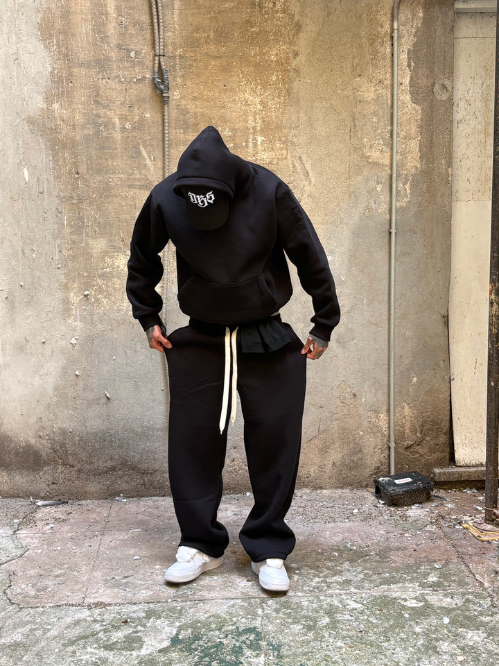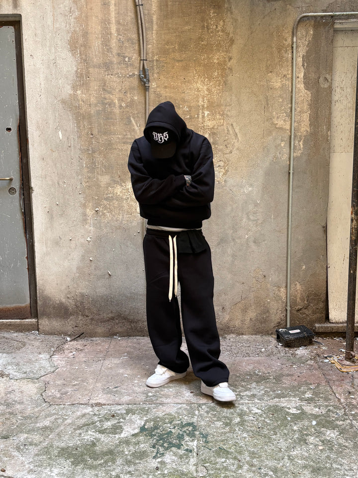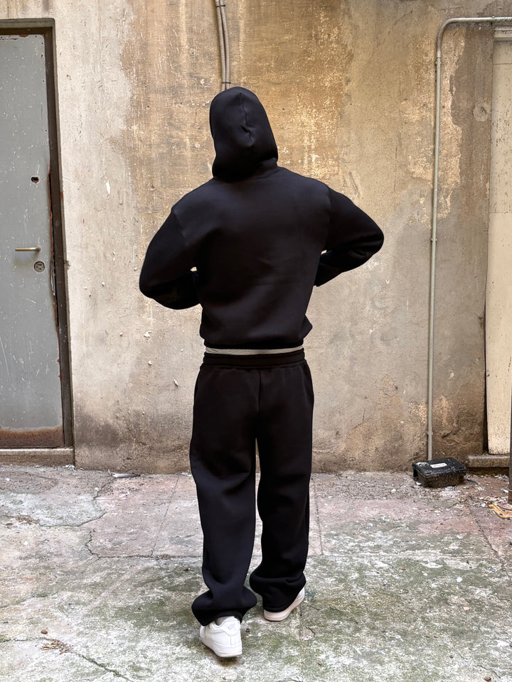 coordset felpato vestibilità boxy con pantalone baggy, il modello in foto è alto 1,82x70 kg indossa una xl.