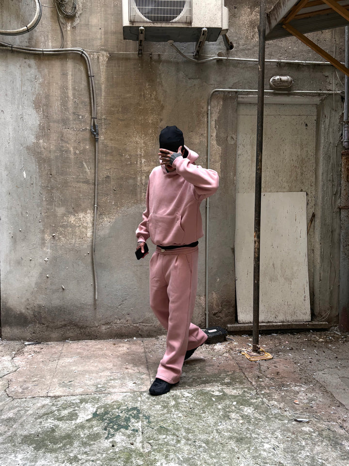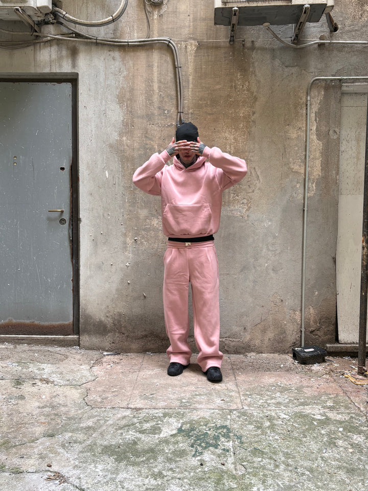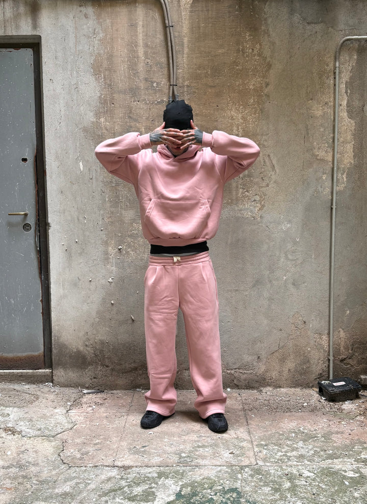 coordset felpato vestibilità boxy con pantalone baggy, il modello in foto è alto 1,82x70 kg indossa una xl